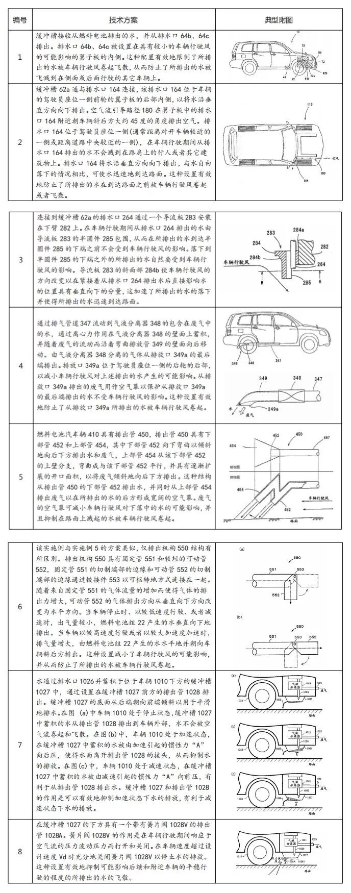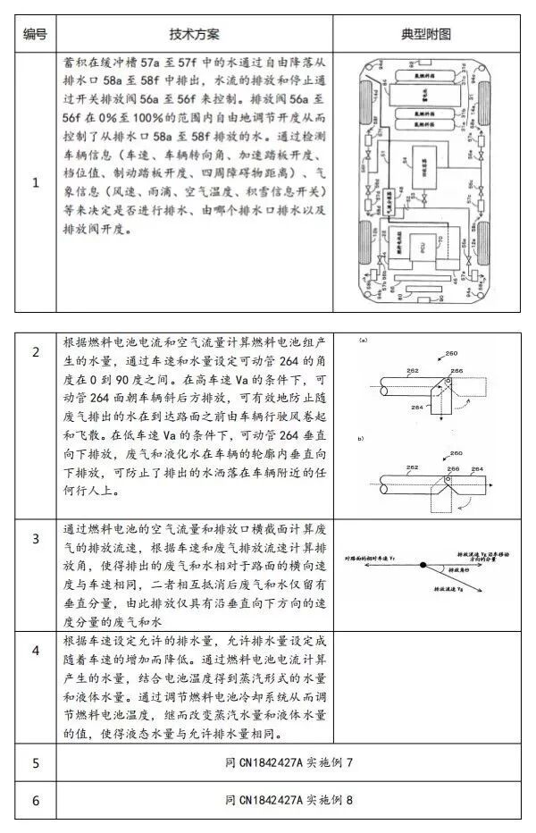 通过CN1842427A、CN1842428A这两篇专利可以看出,丰田针对燃料电池汽车的排水问题做出了充分专利挖掘和布局,从大的方面看,分别通过结构和排水控制算法对技术方案进行保护,从细节看,设计了多种实施例以构建完善的专利壁垒,竞争对手在排水方面很难绕过丰田的专利。