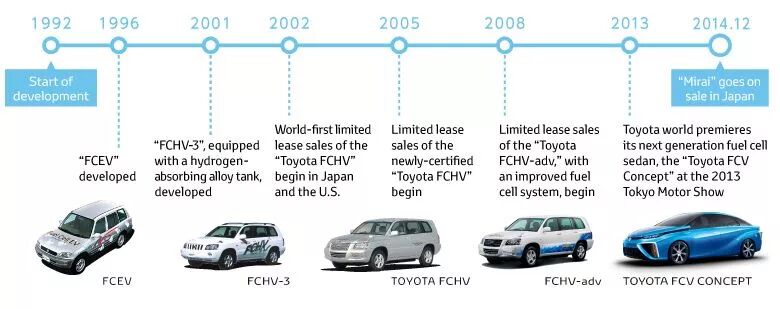 丰田于1992年开始启动对氢燃料电池汽车的研发工作,2002年12月丰田在美国和日本上市第一款燃料电池汽车型“Toyota FCHV”,此后丰田又陆续研发了TOYOTA FCHV,FCHV-adv等车型,经过20年的试错及持续研发,丰田最终在2014年12月推出新一代燃料电池汽车——Mirai。
