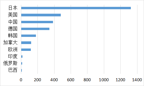 统计丰田在各个国家的专利公布情况,可以看到排在前10位的国家分别为日本、美国、中国、德国、韩国、加拿大、欧洲、印度、俄罗斯和巴西。可以看出丰田很重视在日本本土对相关技术的保护,此外丰田也比较重视美国、中国和德国等国家的市场。
