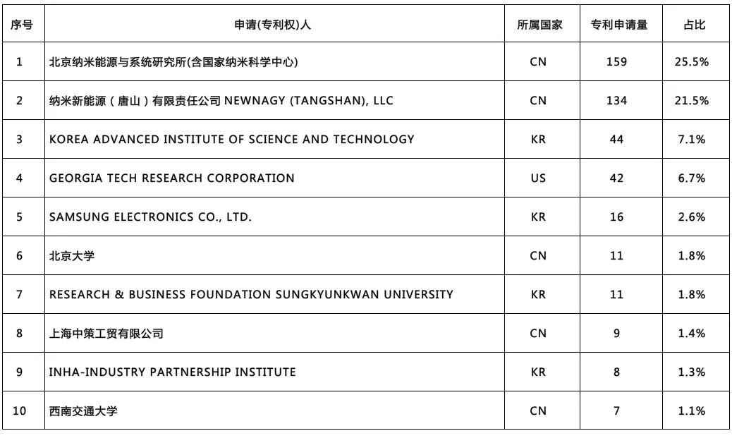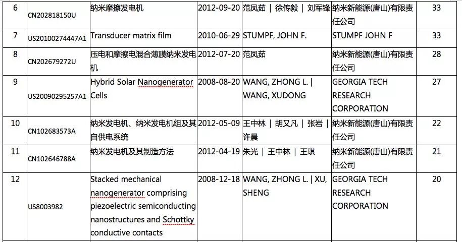 表1 纳米发电机全球专利权人Top10