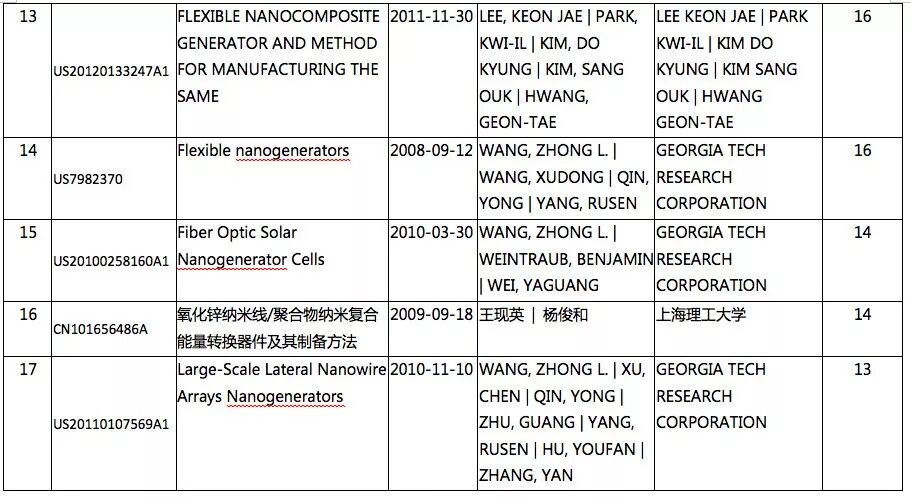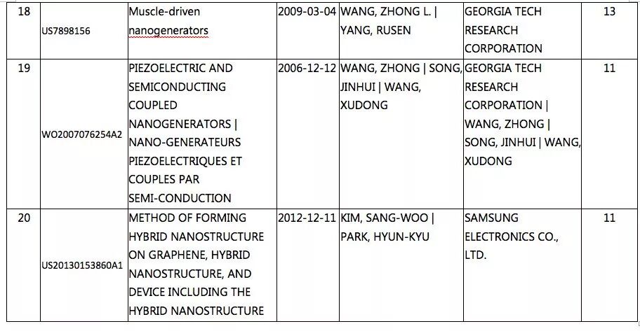 表4 纳米发电机专利被引用次数排序