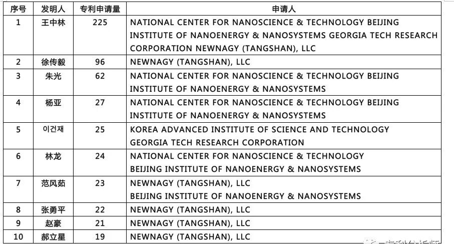 纳米发电机领域全球专利的申请人和发明人主要集中于NATIONAL CENTER FOR NANOSCIENCE & TECHNOLOGY(CN)、BEIJING INSTITUTE OF NANOENERGY & NANOSYSTEMS(CN)、NEWNAGY (TANGSHAN), LLC(CN)、GEORGIA TECH RESEARCH CORPORATION(US)、KOREA ADVANCED INSTITUTE OF SCIENCE AND TECHNOLOGY(KR)等5家机构。在专利核心发明人中,王中林教授的专利数量和质量均独占鳌头,其它核心技术专家也主要来源于王中林教授的研究团队。