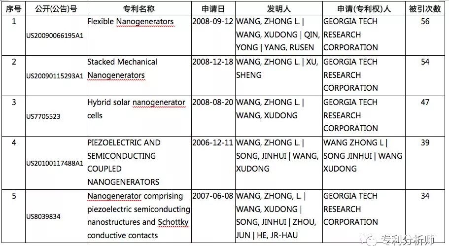 全球首件纳米发电机专利是Piezoelectric and semiconducting coupled nanogenerators,由王中林教授所在的GEORGIA TECH RESEARCH CORPORATION申请。该专利最早的优先权是2005年12月20日的美国优先权60/752558。