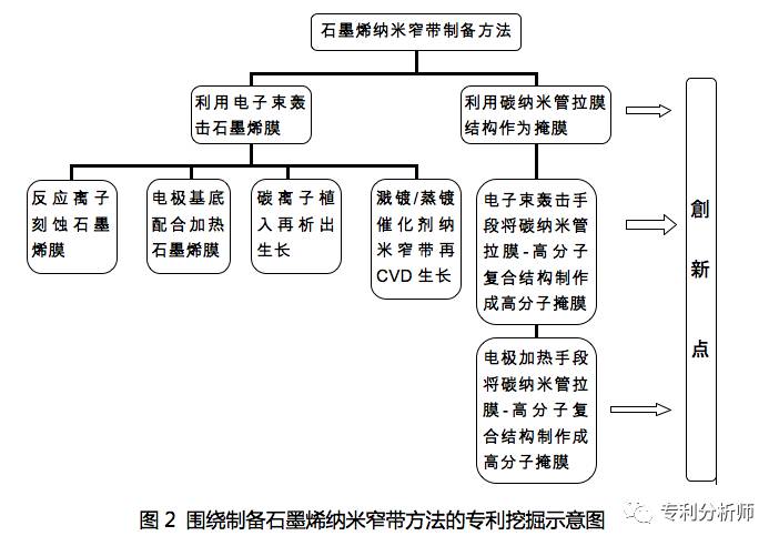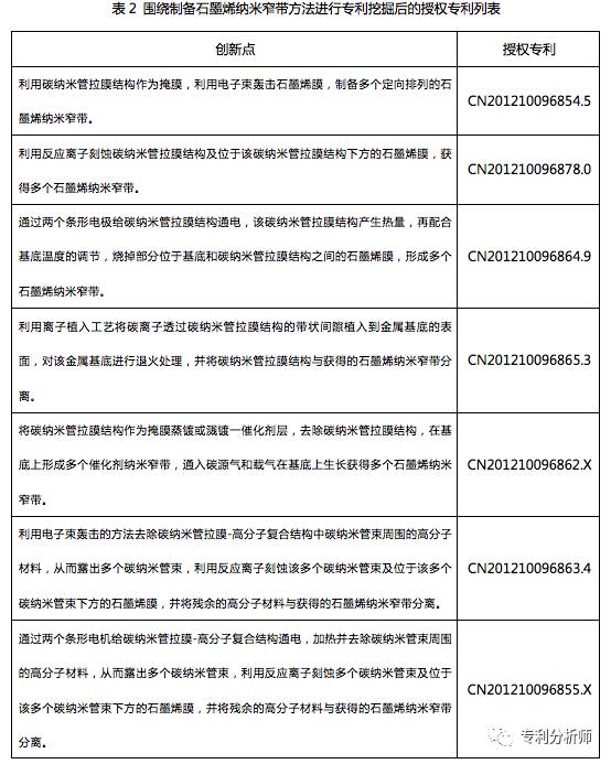 如图2所示为清华大学围绕石墨烯纳米窄带制备方法创新点所进行的专利挖掘情况。表2示出了该专利挖掘工作中产出的授权专利情况。
