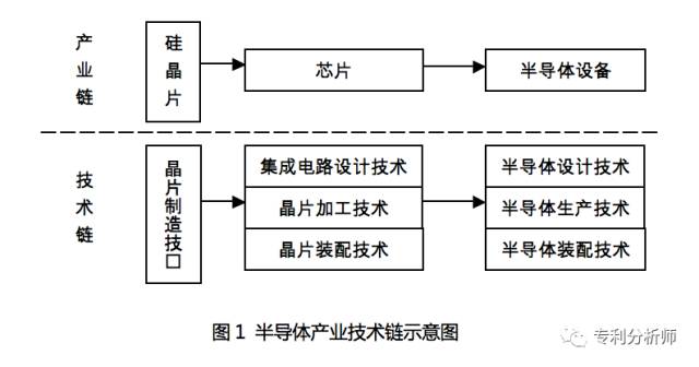 2、沿技术链扩展延伸。各种技术本身可能存在承接关系,即一种技术的获得和使用必须以另一种技术的获得和使用为前提,因此相关技术之间形成了一种链接关系,即为技术链。典型的技术链例如可以是某种技术的上下游技术。将基础创新点沿技术链的方向扩展延伸,既可以基于上下游技术之间的承接关系而保证基础创新点与衍生创新点之间的兼容性,又可以基于技术链的深度和广度而保证扩展延伸的全面性和充分性。例如对于半导体产业,其典型的技术链如图1所示。