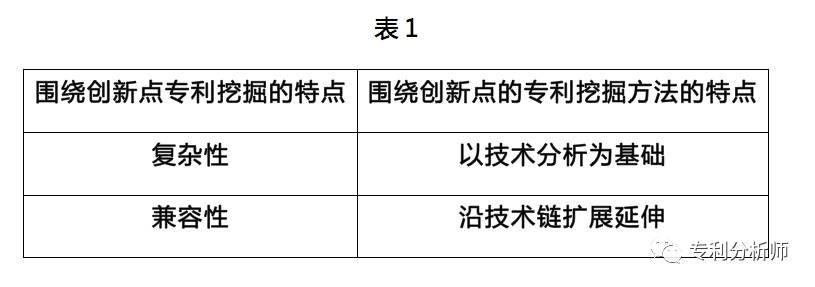 总结以上理论基础,得到如表1所示的内容。可以发现,围绕创新点的专利挖掘手段应以技术分析为基础,根据产业的不同特点,沿技术链进行全面深入扩展延伸,为专利挖掘打下基础。