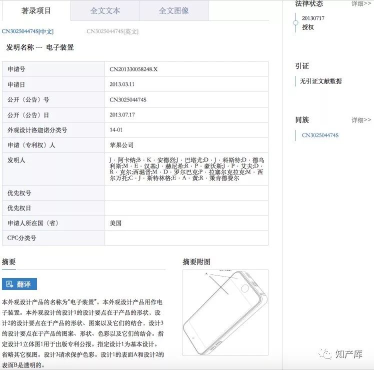 在北知局行政处理程序中,苹果上海公司除了提出被诉侵权产品与涉案专利不相同也不相近似的抗辩主张外,还提出了现有设计抗辩。其提供的现有设计是名称为“电子装置”的外观设计专利。该专利的申请日为2013年3月11日,授权公告日为2013年7月17日,专利号为ZL201330058248.X,专利权人为苹果公司。该外观设计属国际外观设计分类表第14-01类(声音或图象的记录或复制设备)。在该专利简要说明中载明:本外观设计产品的名称为“电子装置”。本外观设计产品用作电子装置。本外观设计的设计1的设计要点在于产品的形状,设计2的设计要点在于产品的形状、图案以及它们的结合,设计3的设计要点在于产品的图案、形状、色彩以及它们的结合。指定设计1立体图1用于出版专利公报。指定设计1为基本设计。省略其它视图。设计3请求保护色彩。设计1的表面A和设计2的表面B是透明的。该外观设计公告包括3个设计,其中设计1包括有主视图、后视图、俯视图、仰视图、左视图、右视图六面视图各一张和立体图4张(见附图8)。