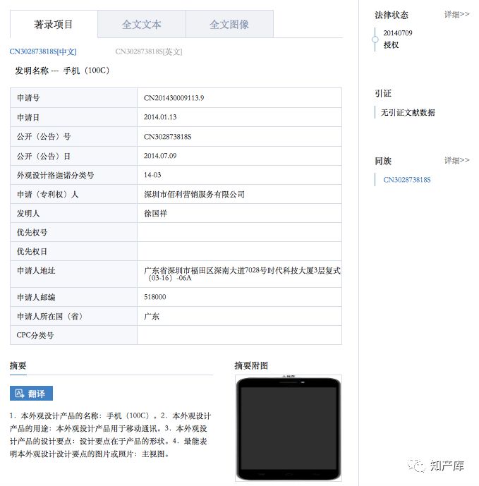 涉案外观设计专利名称为“手机(100C)”,由佰利公司于2014年1月13日提出申请,于2014年7月9日被授权公告,专利权人为佰利公司,专利号为201430009113.9。涉案外观设计属国际外观设计分类表第14-03类(通讯设备或无线电放大器)。目前,该项专利权处于有效期内。涉案专利公告包括有主视图、后视图、俯视图、仰视图、左视图、右视图六面视图各一张(见附图1)。在简要说明中载明:1、本外观设计产品的名称:手机(100C);2、本外观设计产品的用途:本外观设计产品用于移动通讯;3、本外观设计产品的设计要点:设计要点在于产品的形状;4、最能表明本外观设计设计要点的图片或照片:主视图。